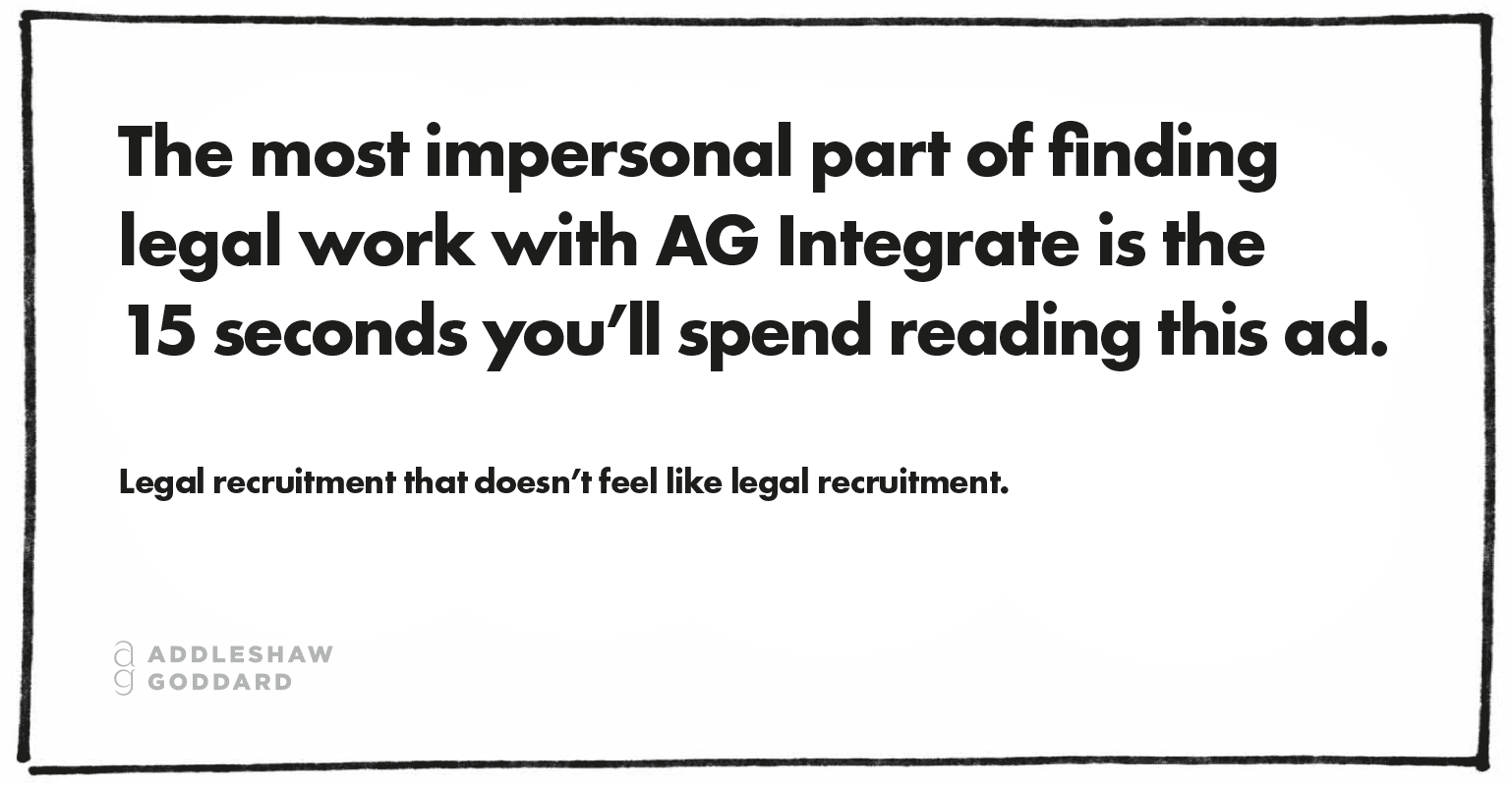 The big idea: To pair the best legal freelancers with the right companies, getting it almost right isn't good enough. The AG Integrate team find out everything they can about the people and companies they represent, and only ever make an introduction when they know there'll be sparks. The relationships they build and time and energy committed to each vacancy was the life blood of their enviable track record.
