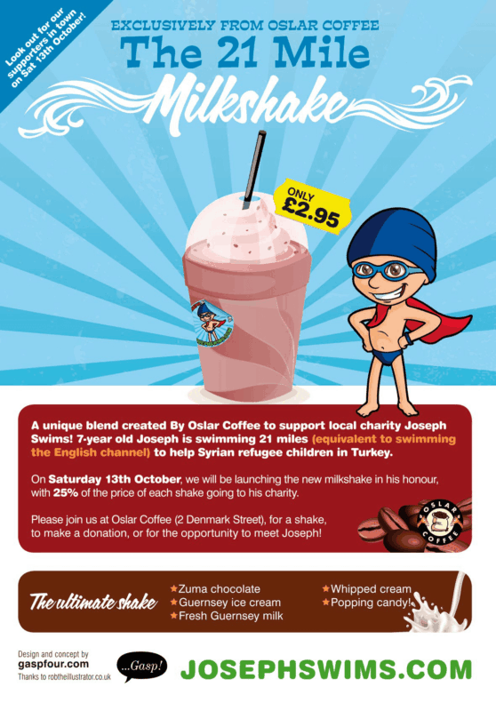 After meeting at Gasp HQ, we were inspired by Joseph’s favourite drink and so created the ultimate ’21 Mile’ chocolate milkshake in his honour. We knew the perfect partner to help us; the independent Wokingham cafe Oslar. They are renowned for continuously doing charity work in the community, and were delighted to help create the shake and donate the sale proceeds to Joseph’s fundraising effort.