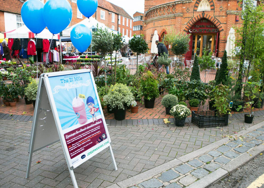 The ’21 mile’ shake (a specially created blend of Zuma chocolate, Guernsey ice cream, fresh Guernsey milk, whipped cream and popping candy), was launched in Wokingham, with banners in the market square, posters, local press attendance and teams of promoters handing out balloons and stickers – all encouraging people to try the new shake and support Joseph. We also used social media and PR to engage a wider audience, which generated fantastic press coverage and a steady stream of donations.