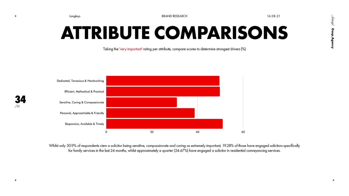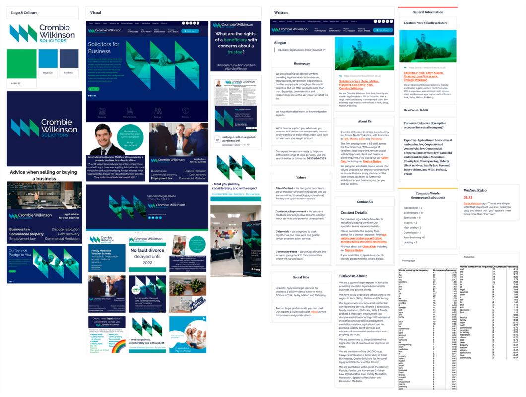 The client had already done an extensive and excellent job of understanding how they were perceived. We validated this and enriched it by combing through a set of 30+ law firms across Yorkshire and the East Midlands, taking record and measures of brand codes including logos, slogans, colours, tone, word frequency and more. Now we had a baseline.