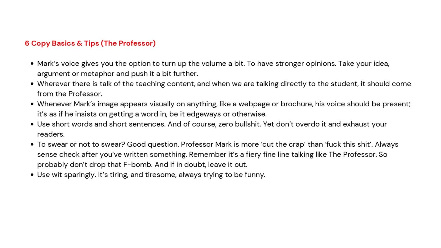 The team behind the Marketing Week Mini MBA series needed guidance on how to talk consistently in the right tone when creating content and comms for the Mini MBA programme; anything from website copy to module descriptions and sales brochures. Crucially, they needed clarity and direction on distinguishing between and using Mark Ritson’s iconic and forthright voice, and that of Marketing Week itself.