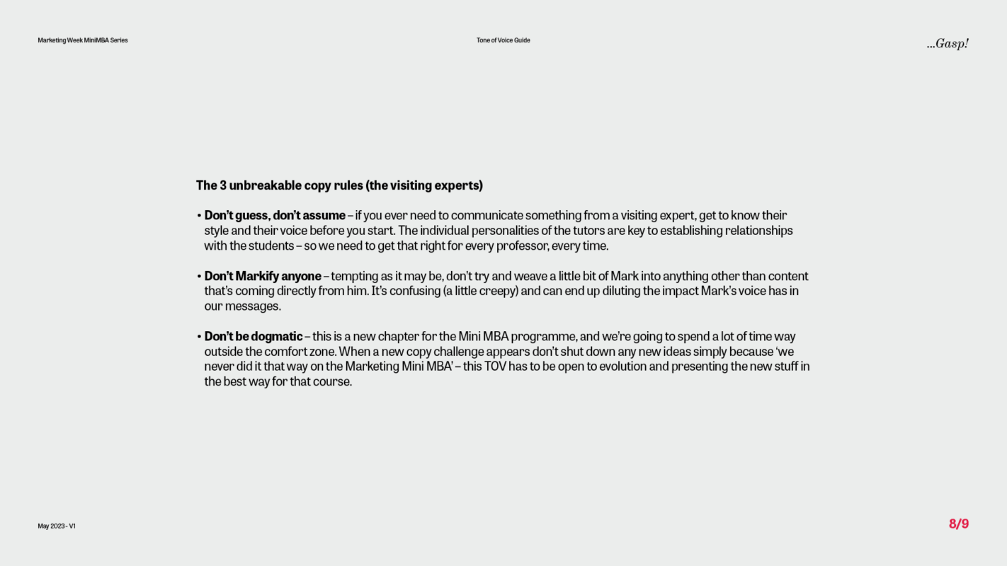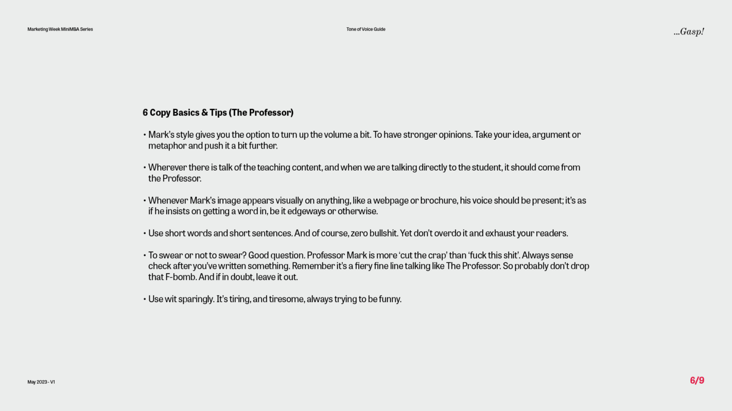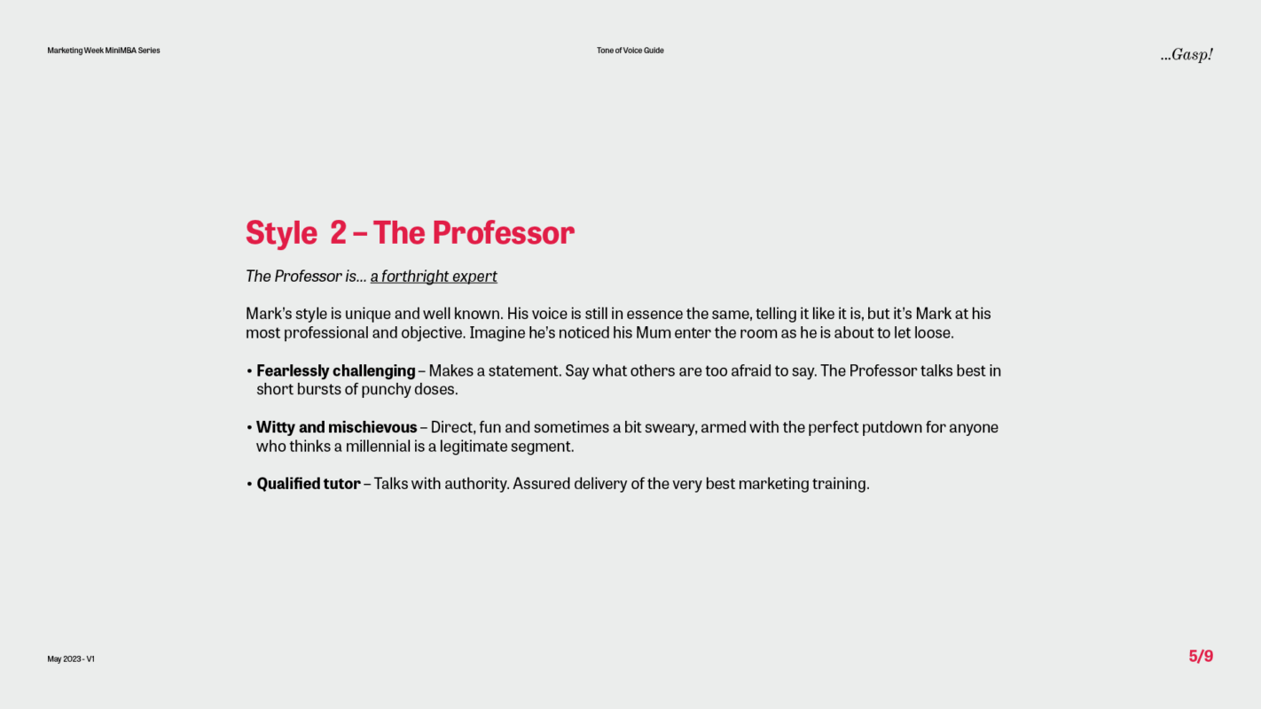 Our first task for the Marketing Week Mini MBA team was to create a tone of voice guide with a difference – one that not only reflected the voice of the programme but also captured the unique personality of the marketing genius behind it all – Professor Mark Ritson.